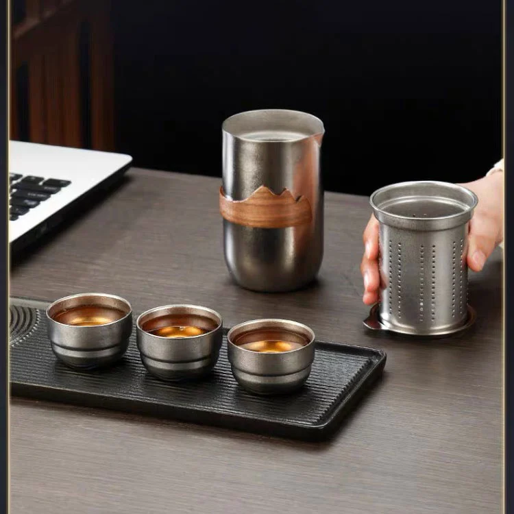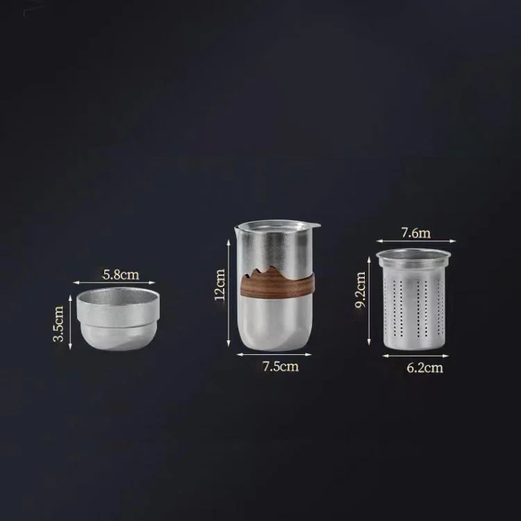 Detta är en tesats för utomhus, den är gjord av titan och förpackning med gåvor. Fyra små titankoppar, en stor Titaniunm -kopp och ett läderfodral. De fyra små kopparna kan enkelt placeras i den stora koppen, och sedan kan den stora koppen läggas i påsen. En ficka räcker för att hålla alla verktyg. Låt dig njuta av stark alkohol utomhus med dina vänner på ett avslappnat sätt.