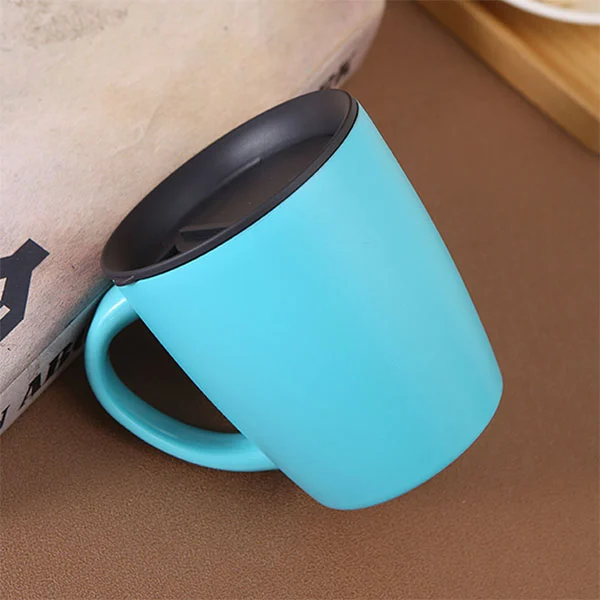 Detta är en trend-utseende kaffemugg i rostfritt stål med lock, rundat utseende, låter dig hålla ett gott humör, placerat på bordet, är också ett konstverk.