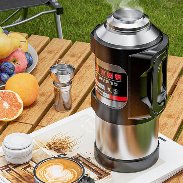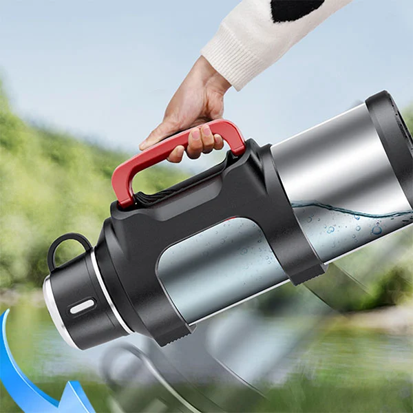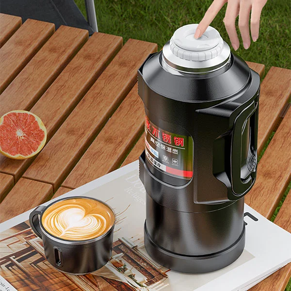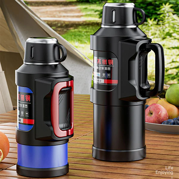 Detta är en termosflask med stor kapacitet med en maximal kapacitet på 6 liter. En hink med vatten motsvarar 12 vanliga mineralvattenflaskor, vilket är tillräckligt för att möta en persons vattenintag i tre dagar under en resa.