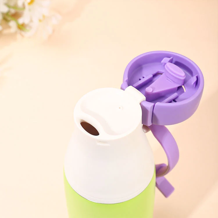 Den 304 rostfria vakuumisolerade flaskan tillhör dopaminmjölkflaskor, med ett cirkulärt lock som enkelt kan öppnas med ett drag och låses med bara ett tryck för att förhindra oavsiktlig öppning av flasklocket.